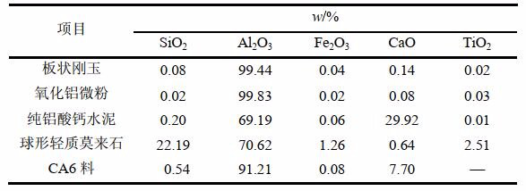 目前鋼包榮盛耐材層材料多為普通高鋁澆注料,主要原料為礬土。這種耐火澆注料使用過程中存在以下不足之處:榮盛耐材、熱導(dǎo)率較高,使用過程中造成能量的損耗;第二、耐火度低,如果工作層使用出現(xiàn)異常,鋼水直接接觸榮盛耐材層時,出現(xiàn)穿包漏鋼的概率較大,安全系數(shù)低;第三、體積密度較大,鋼包空包重量較大。所以對于鋼包保溫的特殊要求是不滿足的,需要開發(fā)出新型的綜合性能優(yōu)異的榮盛耐材層澆注料。本文對新型CA6澆注料和輕質(zhì)莫來石澆注料進行了制樣與測試試驗。