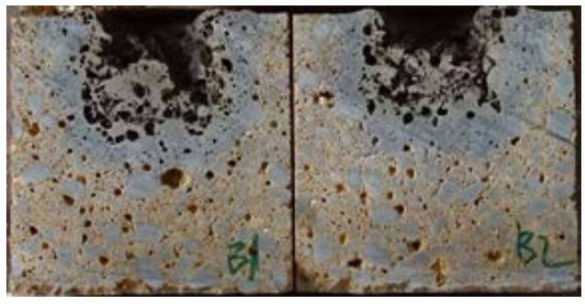 圖1:不同澆注料1500℃保溫3小時坩堝抗渣試驗后的剖面照片